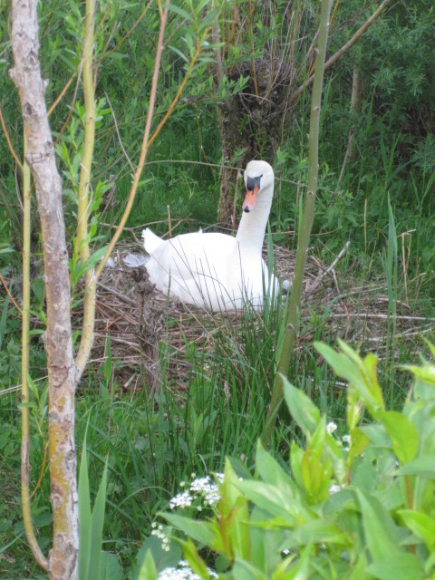 In the Goudse Hout running about the various paths saw at least a dozen pheasants, mostly the male ones as they were squabbling and very noisily drawing attention to themselves, but also a few of the calmer and more camouflaged females. This swan on her nest about 3 metres from one of the paths got up to rearrange her eggs when I was watching - she has 7 of them.